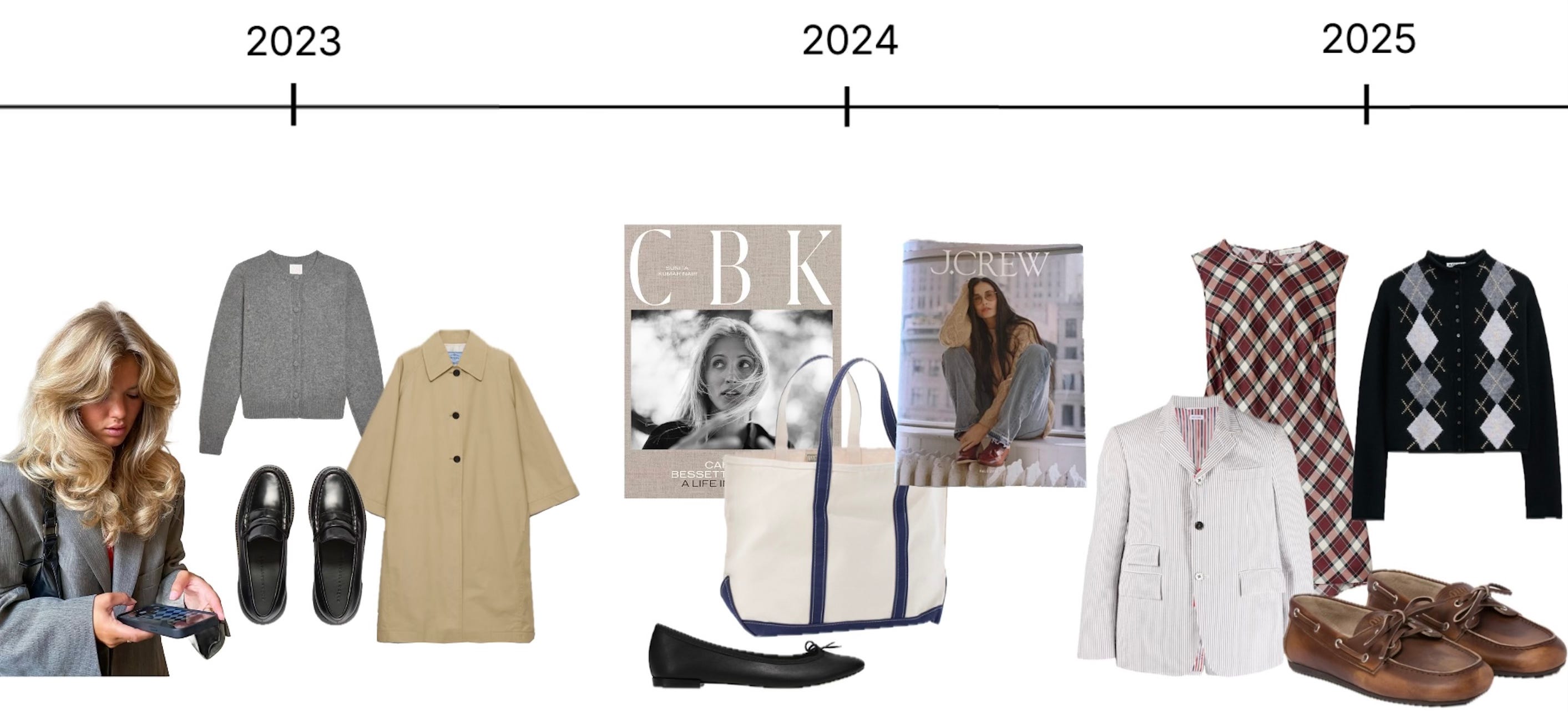 The next year (2024) it’s trench coats, scarves, L.L. Bean totes, ballet flats, sailing aesthetics, and insane buzz around Carolyn Besette Kennedy. An obsession with monogramming (Abbode). The revival of the Jcrew Catalog!!!