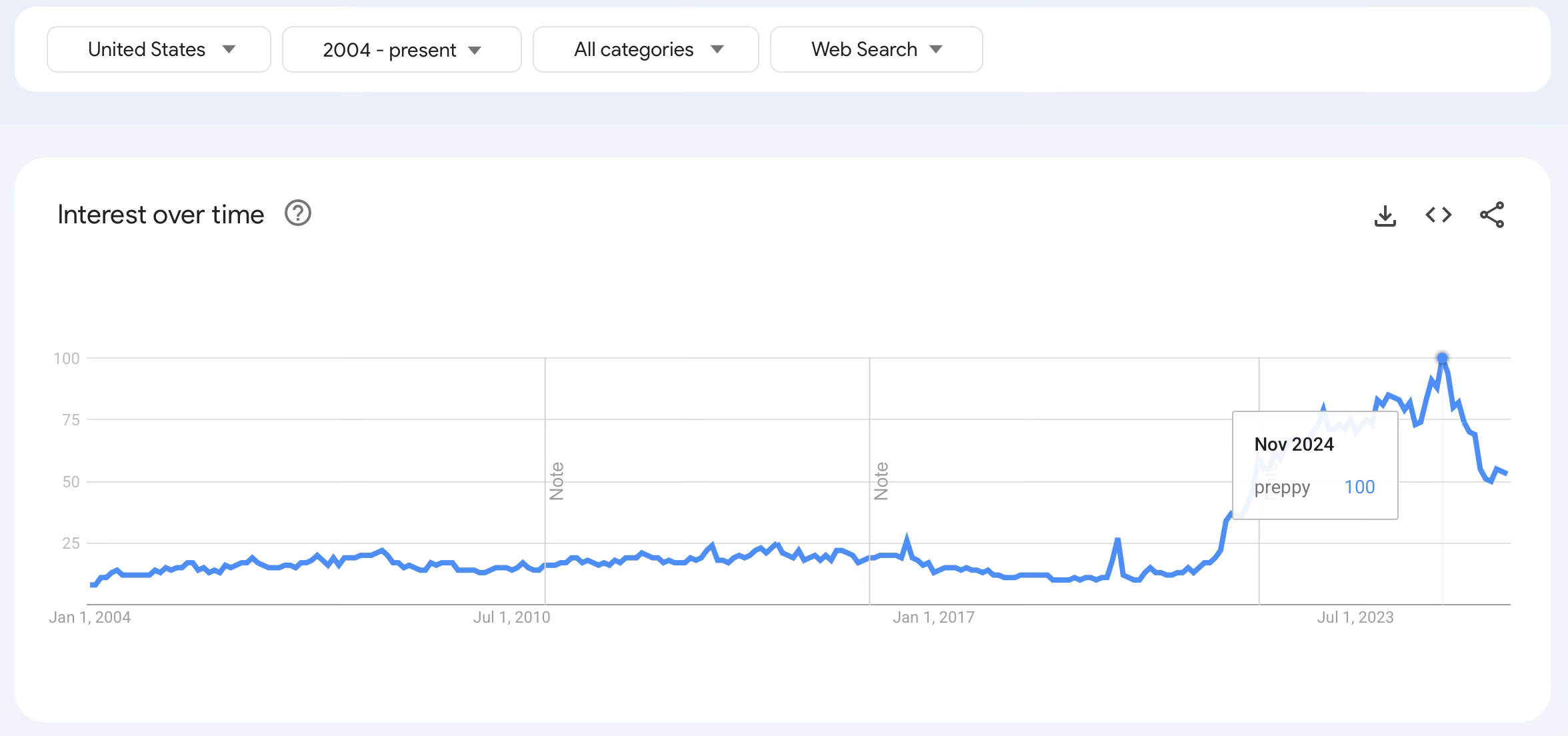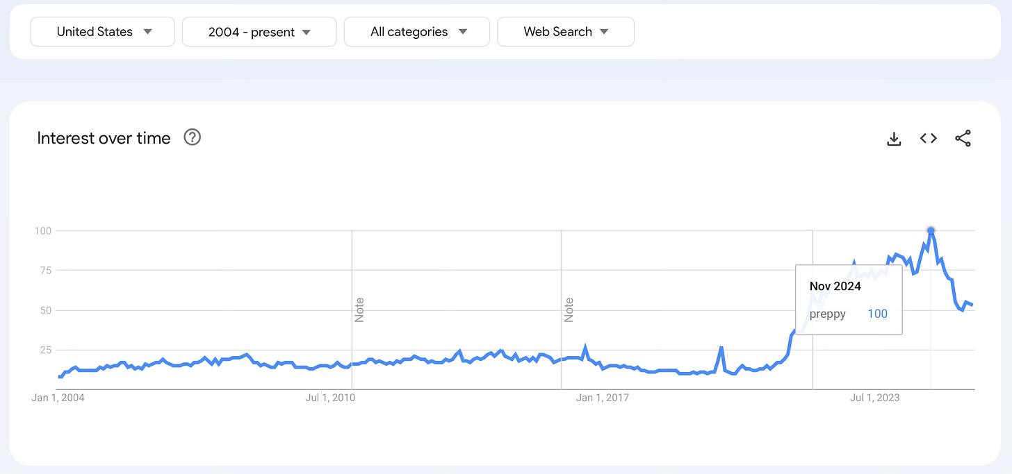 This graph both proves and disproves my theory. It proves that preppy started trending before this year, and that it has only been growing since then. But, it disproves my idea that this trend is continuing forward. It shows the peak of popularity being November of 2024. Maybe argyle is one of the last dying breaths of preppy style in the mainstream?